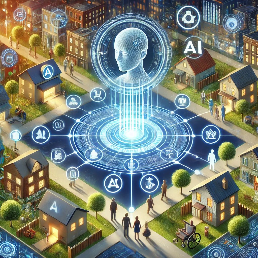 Alt Text: “A futuristic community where AI and humans coexist harmoniously. Digital networks connect homes and public spaces, symbolizing transparency and responsible AI governance. The scene represents an inclusive and ethical approach to AI integration in society.”